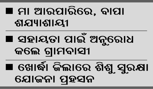 ଖୋର୍ଦ୍ଧା ଅଫିସ,୬ା୮: ଶିଶୁଙ୍କ ଉପଯୁକ୍ତ ସୁରକ୍ଷା, ଶିକ୍ଷା, ଥଇଥାନ ଲାଗି ରାଜ୍ୟ ସରକାର ଗୁରୁତ୍ୱ ଦେଉଛନ୍ତି। ଓଡ଼ିଶା ରାଜ୍ୟ ଶିଶୁ ଅଧିକାର ଆୟୋଗ(ଓଏସ୍ସିପିସିଆର୍) ଶିଶୁଙ୍କ ବିକାଶ ଦିଗରେ ଡିଣ୍ଡିମ ପିଟୁଥିବା ବେଳେ ବାସ୍ତବ ଚିତ୍ର ଅଲଗା ରହିଛି। ମା’ଛେଉଣ୍ଡ ଦୁଇ ଶିଶୁ ଦୁଇ ଓଳି ଖାଇବା ପାଇଁ ଘର ଘର ବୁଲି ଭିକ୍ଷା କରୁଛନ୍ତି। ଘରେ ରୋଗଗ୍ରସ୍ତ ବାପା। ଏପଟେ ସାନ ଭାଇର ଭବିଷ୍ୟତ ଲାଗି ୧୦ବର୍ଷର ଶିଶୁ କାନ୍ଧରେ ରହିଛି ପରିବାର ବୋଝ। ପାଠପଢ଼ା ବୟସରେ ସେ ମୂଲ ଲାଗି ପରିବାର ଚଳାଇବା ପାଇଁ ସଂଘର୍ଷ କରୁଛି। ଦିନେ କି ଦୁଇ ଦିନ ନୁହଁ ଗତ ଦୁଇ ବର୍ଷ ଧରି ସଂଘର୍ଷ ଜାରି ରଖିଥିବା ଖୋର୍ଦ୍ଧା ଜିଲା ବେଗୁନିଆ ବ୍ଲକ ଅଧୀନ ଭୂଇଁପୁର ଗ୍ରାମରେ ଦେଖିବାକୁ ମିଳିଛି।
