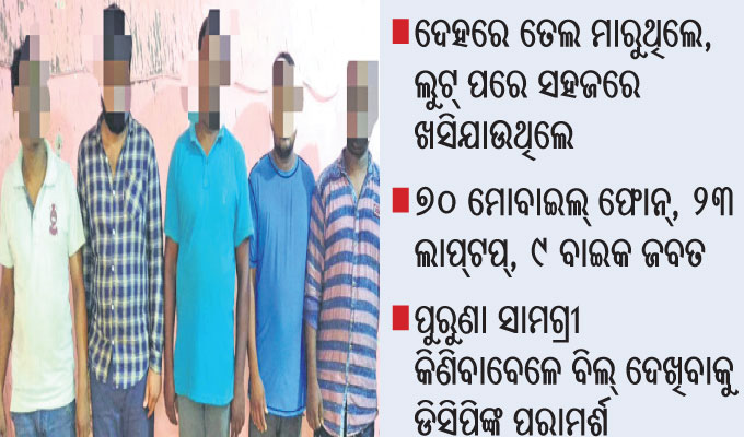 ଗତ କିଛିଦିନ ହେବ ରାଜଧାନୀରେ ଲୁଟ୍ ଓ ଚୋରି ବଢ଼ି ଯାଇଥିଲା। ପୋଲିସ ଅଧିକାରୀ ମଧ୍ୟ ବର୍ତ୍ତି ପାରି ନ ଥିଲେ। ଶେଷରେ ଏମାନଙ୍କୁ ଧରିବା ପାଇଁ ୩ଟି ସ୍କ୍ବାଡ୍ ଗଠନ କରାଯାଇ ଜେଲ୍ ଫେରନ୍ତା ଲୁଟେରାଙ୍କ ଉପରେ ନଜର ରଖିଥିଲା। ଏନେଇ ଏକ ତାଲିକା ପ୍ରସ୍ତୁତ କରାଯାଇ ଚଢ଼ାଉ ଆରମ୍ଭ ହୋଇଥିଲା। ପୋଲିସ ଦେଇଥିବା ସୂଚନାନୁସାରେ, ଗିରଫ ମଣ୍ଟୁ ଗ୍ୟାଙ୍ଗ୍ ଗଢି ଖଣ୍ଡଗିରି ଓ ତମାଣ୍ଡୋ ଥାନା ଅଞ୍ଚଳରେ ଥିବା ଛାତ୍ରାବାସକୁ ଟାର୍ଗେଟ କରୁଥିଲେ। ଦିନରେ ବ୍ଲୁପ୍ରିଣ୍ଟ୍ ପ୍ରସ୍ତୁତ କରିବା ପରେ ରାତିରେ ସହଯୋଗୀଙ୍କ ସହ ସେ ବାଲ୍କୋନି ଦେଇ ହଷ୍ଟେଲରେ ପଶି ଲାପ୍ଟପ୍ ଓ ମୋବାଇଲ୍ ଫୋନ୍ ସମେତ ଯାହା ପାରୁଥିଲେ ଚୋରି କରୁଥିଲେ। ତେବେ ଯେପରି କେହି ସହଜରେ ଧରିପାରିବେ ନାହିଁ ସେଥିପାଇଁ ସେମାନେ ଦେହରେ ତେଲ ବୋଳି ଯାଉଥିଲେ। ରବିବାର ରାତିରେ ଖଣ୍ଡଗିରି ଅଞ୍ଚଳରେ ଯାଞ୍ଚବେଳେ ମଣ୍ଟୁ ଧରାପଡିଥିଲେ। ତାଙ୍କୁ ପଚରାଉଚରା ପରେ ପୋଲିସ ବିଭିନ୍ନ ସ୍ଥାନରେ ଚଢାଉ କରି ଚୋରି ସାମଗ୍ରୀ ଜବତ କରିବା ସହ ସେସବୁକୁ କିଣିଥିବା ୪ଜଣଙ୍କୁ ଗିରଫ କରାଯାଇଥିଲା।