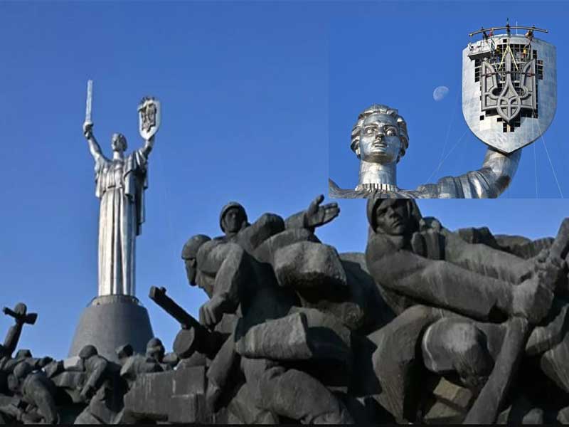 ୟୁକ୍ରେନ ମାତୃଭୂମି ସ୍ମାରକର ଢାଲରେ ଥିବା ସୋଭିଏତ ହାତୁଡ଼ି ଏବଂ ଦା ପ୍ରତୀକ ହଟାଇ ଏକ ତ୍ରିଶୁଳ ଲଗାଇଛି।