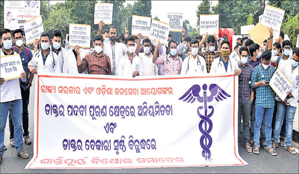 ଭୁବନେଶ୍ୱର,୯।୧୨: ସରକାର କହୁଛନ୍ତି ରାଜ୍ୟରେ ଡାକ୍ତର ନାହାନ୍ତି। କିନ୍ତୁ ଏପଟେ ୧୬୦୦ ଡାକ୍ତର ବେକାର ହୋଇ ବସିଛନ୍ତି। ଏଭଳି ଅଭିଯୋଗ ଆଣି ବେକାର ବସିଥିବା ଡାକ୍ତରମାନେ ବୁଧବାର ଆନ୍ଦୋଳନକୁ ଓହ୍ଲାଇଥିଲେ। ବିଧାନସଭା ସମ୍ମୁଖ ଲୋୟର ପିଏମ୍ଜିରେ ଧାରଣାରେ ବସିବା ସହ ବିକ୍ଷୋଭ ପ୍ରଦର୍ଶନ ମାଧ୍ୟମରେ ଦାବି ରଖିଥିଲେ। ଓପିଏସ୍ସି ଦ୍ୱାରା ୨୦୨୧-୨୨ ପାଇଁ ଆସିଥିବା ନିଯୁକ୍ତିପତ୍ରକୁ ବାତିଲ କରିବା ସହ ଯଥାଶୀଘ୍ର ନୂତନ ନିଯୁକ୍ତି ପ୍ରକ୍ରିୟା ଆରମ୍ଭ କରିବା ଓ ପରୀକ୍ଷା ପରେ ଓ୍ବେଟିଂ ଲିଷ୍ଟ ଜାରି କରିବାକୁ ସେମାନେ ଦାବି କରିଛନ୍ତି। ବର୍ତ୍ତମାନ ନିଯୁକ୍ତିପତ୍ରରେ ୧୮୭୧ଟି ପଦବୀରେ ସାଧାରଣ ବର୍ଗ ଡାକ୍ତରଙ୍କ ପାଇଁ ୧୯୬ଟି ପଦବୀ ଅଛି। କିନ୍ତୁ ସାଧାରଣ ବର୍ଗରେ ୧୬୦୦ଡାକ୍ତର ଘରେ ବସିଛନ୍ତି। ଏତେ ସଂଖ୍ୟକ ସଂରକ୍ଷିତ ବର୍ଗର ପଦବୀ ବର୍ଷବର୍ଷ ଧରି ଖାଲି ପଡ଼ୁଥିବା ସତ୍ତ୍ୱେ ୧୬୭୫ ସଂରକ୍ଷିତ ପଦବୀ ପାଇଁ ୧୦୦ଟି ସଂରକ୍ଷିତ ବର୍ଗର ଡାକ୍ତର ନାହାନ୍ତି। ସରକାର ଡାକ୍ତର ନ ଥିବାର ଏକ କୃତ୍ରିମ ଅଭାବ ସୃଷ୍ଟି କରୁଛନ୍ତି ବୋଲି ଏସିବି ଛାତ୍ର ସଂସଦର ପୂର୍ବ ସଭାପତି ଡା. ଦୀପକ ସାମଲ କହିଛନ୍ତି। ଏପରିକି ଭାଜପା ବିଧାୟକ ଡାକ୍ତର ବୁଦ୍ଦାନ ମୁର୍ମୁ ଓ ନବ ଚରଣ ମାଝି ଏହି ସମସ୍ୟାର ସମାଧାନ ସହ ବିଧାନସଭାରେ ଏ ବିଷୟରେ ଉଠାଇବାକୁ ପ୍ରତିଶ୍ରୁତି ଦେଇଥିବା ସେ ଜଣାଇଛନ୍ତି। ଏହି ଅବସରରେ ଡାକ୍ତର ପ୍ରତିନିଧି ଦଳ ରାଜ୍ୟପାଳଙ୍କ ଉଦ୍ଦେଶ୍ୟରେ ଦାବିପତ୍ର ଦେବା ସହ ମୁଖ୍ୟମନ୍ତ୍ରୀଙ୍କ ଅଭିଯୋଗ ପ୍ରକୋଷ୍ଠରେ ସ୍ବାସ୍ଥ୍ୟ ବିଭାଗର ଅତିରିକ୍ତ ଶାସନ ସଚିବଙ୍କୁ ଭେଟି ଦାବି ଓ ସମସ୍ୟା ବିଷୟରେ ଆଲୋଚନା କରିଥିଲେ।