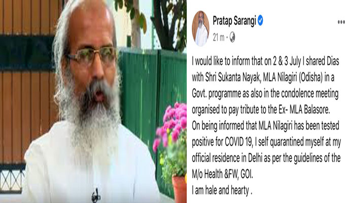ବାଲେଶ୍ୱର ଅଫିସ, ୬ା୭- କେନ୍ଦ୍ର ଏମଏସଏମ୍ଇ ମନ୍ତ୍ରୀ ପ୍ରତାପ ଷଡଙ୍ଗୀ ଚଳିତମାସ ୨ ଓ ୩ ତାରିଖରେ ନୀଳଗିରି ବିଧାୟକ ଇଂ ସୁକାନ୍ତ ନାୟକଙ୍କ ସହ ସରକାରୀ କାର୍ଯ୍ୟକ୍ରମ ଓ ବାଲେଶ୍ୱର ସଦର ବିଧାୟକ ମଦନମୋହନ ଦତ୍ତଙ୍କ ଏକାଦଶାହ କାର୍ଯ୍ୟରେ ଯୋଗ ଦେଇଥିଲେ। ବିଧାୟକ ନାୟକ କରୋନାରେ ସଂକ୍ରମିତ ହୋଇଥିବା ସୋମବାର ଜଣାପଡିବା ପରେ ସେ ନୂଆଦିଲ୍ଲୀସ୍ଥିତ ସରକାରୀ ବାସଭବନରେ ହୋମ କ୍ୱାରାଣ୍ଟାଇନରେ ରହିଥିବା କେନ୍ଦ୍ରମନ୍ତ୍ରୀ ଷଡଙ୍ଗୀ ଟୁଇଟ୍ କରି ଜଣାଇଛନ୍ତି।
