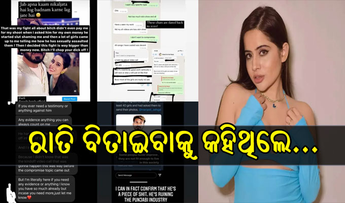 ସୋସିଆଲ ମିଡିଆ ସେନସେଶନ ଉର୍ଫିଙ୍କୁ ଆବେଦ ଆଫ୍ରିଦି ନାମକ ଜଣେ ନିର୍ଦ୍ଦେଶକ କାଷ୍ଟ କରିବାର ପ୍ରତିଶ୍ରୁତି ଦେଇ ତାଙ୍କ ସହ ରାତି କଟାଇବାକୁ ଦାବି କରିଥିବା ସେ ଅଭିଯୋଗ କରିଛନ୍ତି। ସେ ତାଙ୍କ ଇନ୍ଷ୍ଟାଗ୍ରାମ ଷ୍ଟୋରୀରେ ଆବେଦଙ୍କ ସହ ହ୍ବାଟ୍ସଆପ୍ ଜରିଆରେ ହୋଇଥିବା ଚାଟ୍ର ସ୍କ୍ରିନସଟ୍ ଶେୟାର କରିଛନ୍ତି। ସେଥିରୁ କାମ ବଦଳରେ ଉର୍ଫିଙ୍କୁ ସେ କମ୍ପ୍ରମାଇଜ୍ କରିବାକୁ କହୁଥିବା ସ୍ପଷ୍ଟ ହେଉଛି।