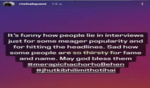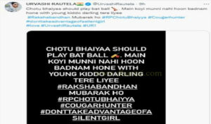 ନିକଟରେ ଉର୍ବଶୀ ଏକ ସାକ୍ଷାତକାରରେ ସିଧାସଳଖ ଭାବେ ପନ୍ତଙ୍କ ନାମ ନ ନେଇ ଆର୍ପି ବୋଲି ସମ୍ବୋଧୀତ କରି କିଛି ବ୍ୟକ୍ତିଗତ କଥା କହିଥିଲେ। ଏହାପରେ ପନ୍ତ ଇନ୍ଷ୍ଟାଗ୍ରାମରେ ଲେଖିଥିଲେ, ଏହା ବେଶ ମଜାଦାର। କିଭଳି ଭାବେ ଲୋକମାନେ ସାମାନ୍ୟ ଲୋକପ୍ରିୟତା ପାଇବା ଲାଗି ସାକ୍ଷାତକାରରେ ମିଛ କୁହନ୍ତି। ଦୁଃଖର କଥା କିଛି ଲୋକ ନାଁ ଏବଂ ଖ୍ୟାତି ଲାଗି ବହୁତ ଭୋକିଲା। ଭଗବାନ ସେମାନଙ୍କ ଉପରେ ସର୍ବଦା ଅନୁଗ୍ରହ ରଖନ୍ତୁ। ହ୍ୟାସଟ୍ୟାଗ୍ରେ ‘ମୋତେ ଅନୁସରଣ କରିବା ଛାଡ଼ିଦିଅ ଭଉଣୀ। ମିଛର ମଧ୍ୟ ସୀମା ଅଛି ବୋଲି ଲେଖିଥିଲେ।