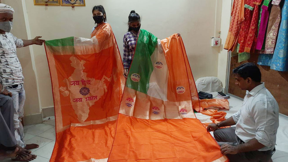 ବାରାଣସୀ,୧୪।୮: ପର୍ବଗୁଡ଼ିକରେ ପୋଷାକର ବିଶେଷ ମହତ୍ତ୍ୱ ରହିଛି। ବିଭିନ୍ନ ପର୍ବ ଅନୁଯାୟୀ ପାରମ୍ପରିକ ପୋଷାକରେ ମଧ୍ୟ ପରିବର୍ତ୍ତନ ଆସିଥାଏ। ଆଉ ଯଦି ଜାତୀୟ ପର୍ବ କଥା ପଡ଼େ ତେବେ ଜଳବାୟୁରେ ବି ଦେଶଭକ୍ତି ପରିଲକ୍ଷିତ ହେବା ସହ ତ୍ରିରଙ୍ଗା ରଙ୍ଗରେ ରଙ୍ଗେଇଯାଏ। ସାରା ବିଶ୍ୱରେ ରେଶମ ସୂତାରେ ନିର୍ମିତ ବନାରସୀ ଶାଢ଼ି ପାଇଁ ପ୍ରସିଦ୍ଧ ସହର ବନାରସରେ ଚଳିତ ଥର ୭୪ତମ ସ୍ବାଧୀନତା ଦିବସ ଉପଲକ୍ଷେ ସ୍ବତନ୍ତ୍ର ପ୍ରସ୍ତୁତି କରାଯାଇଛି। ବନାରସର ଦୋକାନଗୁଡ଼ିକରେ ଚଳିତ ବର୍ଷ ଏକ ନିଆରା ରେଶମୀ ତ୍ରିରଙ୍ଗାର ୨ଟି ଡିଜାଇନ୍ର ଶାଢ଼ି ବିକ୍ରି ହେଉଛି। ଗୋଟିଏରେ କେବଳ ଭାରତର ନକ୍ସା ଡିଜାଇନ୍ କରାଯାଇନାହିଁ ବରଂ ଜୟ ହିନ୍ଦ୍-ଜୟ ଭାରତ ମଧ୍ୟ ଲେଖାହୋଇଛି।