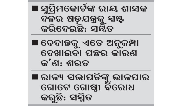 ପିସିସି ସଭାପତି ଶରତ ପଟ୍ଟନାୟକ କହିଛନ୍ତି, ବେଦାନ୍ତ ବିଶ୍ୱବିଦ୍ୟାଳୟ ଜମି ଅଧିଗ୍ରହଣ ମାମଲାର ସୁପ୍ରିମ କୋର୍ଟଙ୍କ ରାୟ ପ୍ରକାଶ ପରେ କାହିଁକି ମୁଖ୍ୟମନ୍ତ୍ରୀ ତାଙ୍କ ପଦରୁ ଇସ୍ତଫା ଦେଉନାହାନ୍ତି। ଏ ସରକାର ଆଇନକୁ ସର୍ବମାନ୍ୟ ବୋଲି ଦ୍ୱାହି ଦେଉଥିଲା ବେଳେ ସୁପ୍ରିମକୋର୍ଟର ରାୟ ପ୍ରକାଶ ପାଇବା ପରେ ମୁଖ୍ୟମନ୍ତ୍ରୀ କାହିଁକି ପୁଣି ନିଜ ପଦବୀକୁ ମାଡ଼ି ବସିଛନ୍ତି। ସୁପ୍ରିମକୋର୍ଟ କେବେହେଲେ ପୂର୍ବରୁ ଏଭଳି କଟୁ ଭାଷାରେ ଓଡ଼ିଶା ସରକାରଙ୍କୁ ଭର୍ତ୍ସନା କରିନାହାନ୍ତି। ରାଜ୍ୟ ସରକାର କାହିଁକି ଗୋଟିଏ ଘରୋଇ କମ୍ପାନୀକୁ ଏତେ ଅନୁକମ୍ପା ଦେଖାଇବା ପଛରେ ମୂଳ କାରଣ କ’ଣ ବୋଲି ସେ ପ୍ରଶ୍ନ କରିଛନ୍ତି।