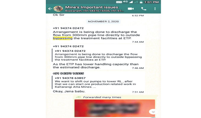 ଅନ୍ୟପକ୍ଷରେ ଖଣିର ପାଣି ବାହାରକୁ ଛଡ଼ାଯାଉଥିବା ନେଇ ଖଣି କର୍ମଚାରୀଙ୍କ ମଧ୍ୟରେ ହ୍ବାଟ୍ସଆପ୍ ଗ୍ରୁପ୍ ‘ମାଇନ୍ସ ଇମ୍ପର୍ଟେଣ୍ଟ ଇସ୍ୟୁଜ୍’ରେ ହୋଇଥିବା କଥାବାର୍ତ୍ତାକୁ ଧ୍ୟାନ ଦିଆଯାଇନାହିଁ। ଏନେଇ ପୂର୍ବରୁ ହୋଇଥିବା ଅଭିଯୋଗରେ ଗୁରୁତ୍ୱ ଦେବାକୁ ନିବେଦନ କରାଯାଇଥିଲା। ଉକ୍ତ ହ୍ବାଟ୍ସଆପ୍ ଗ୍ରୁପ୍ରେ ଇଟିପି ମ୍ୟାନେଜର ସାରସ୍ବତ ନନ୍ଦ ଇଟିପିକୁ ବାଇପାସ୍ କରି ସିଧା ବାହାରକୁ ପାଣି ଛାଡିବାକୁ କହିଥିବା ସ୍ପଷ୍ଟ ଭାବେ ଜଣାପଡ଼ିଛି। ଏହାସହ ଏସ୍ପିସିବି ପକ୍ଷରୁ କାର୍ବନ ଫୁଟ୍ପ୍ରିଣ୍ଟ ଭଳି ପ୍ରଯୁକ୍ତି ବିଜ୍ଞାନ ପ୍ରଣାଳୀକୁ ତଦନ୍ତରେ ଜାଣିଶୁଣି ପ୍ରୟୋଗ କରାଯାଇନାହିଁ ବୋଲି ଅଭିଯୋଗକାରୀ ରାଜେଶ କୁମାର ସିଂ ତାଙ୍କ ଅଭିଯୋଗରେ ଦର୍ଶାଇଛନ୍ତି। ଏହାସହ ବର୍ଜ୍ୟଜଳ ପରିମାଣ ଅନୁଯାୟୀ ଇଟିପି ଜରିଆରେ ବିଶୋଧନ କରି ପାଣି ଛାଡ଼ିବା ଏଠାରେ ସମ୍ଭବ ନୁହେଁ ବୋଲି ଅଭିଯୋଗରେ ଉଲ୍ଲେଖ କରାଯାଇଛି। ଖଣିର ବର୍ଜ୍ୟଜଳ ଦ୍ୱାରା ଡମଶାଳା ନାଳ ଓ ବ୍ରାହ୍ମଣୀ ନଦୀ ପାଣି ବିଷାକ୍ତ ହୋଇଛି। ଏହାକୁ ତୁରନ୍ତ ନିୟନ୍ତ୍ରଣ କରା ନ ଗଲେ ଆଗାମୀ ଦିନରେ ଖଣି ଅଞ୍ଚଳର ଜନବସତି ଉପରେ ବିପଦ ନିଶ୍ଚିତ ବୋଲି ମତପ୍ରକାଶ ପାଉଛି।