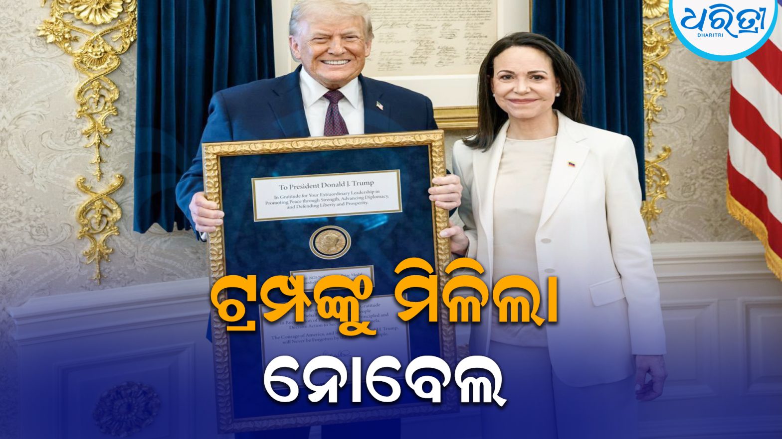 ନୂଆଦିଲ୍ଲୀ,୧୬ା୧: ବହୁ ପ୍ରତିକ୍ଷାର ଅନ୍ତ ଘଟି ଶେଷରେ ଅନ୍ଵେରିକା ରାଷ୍ଟ୍ରପତି ଡୋନାଲ୍ଡ ଟ୍ରମ୍ପଙ୍କୁ ନୋବେଲ ଶାନ୍ତି ପୁରସ୍କାର ମିଳିଛି। ଭେନେଜୁଏଲାର ବିରୋଧୀ ଦଳ ନେତ୍ରୀ ତଥା ନୋବେଲ ଶାନ୍ତି ପୁରସ୍କାର ବିଜେତା ମାରିଆ କୋରିନା ମାଚାଡୋ ଗୁରୁବାର ହ୍ୱାଇଟ ହାଉସରେ ଟ୍ରମ୍ପଙ୍କୁ ଭେଟି ନିଜର ନୋବେଲ ପଦକ ପ୍ରଦାନ କରିଛନ୍ତି। ଭେନେଜୁଏଲାର ସ୍ୱାଧୀନତା ପ୍ରତି ଟ୍ରମ୍ପଙ୍କ ଅଦ୍ୱିତୀୟ ପ୍ରତିବଦ୍ଧତାର ସମ୍ମାନ ସ୍ୱରୂପ ସେ ଏହି ପଦକ ଉପହାର ଦେଇଥିବା ପ୍ରକାଶ କରିଛନ୍ତି। ଏହାକୁ ସେ ଦୁଇ ଦେଶର ବନ୍ଧୁତ୍ୱ ଓ ମୁକ୍ତି ସଂଗ୍ରାମର ପ୍ରତୀକ ବୋଲି ଅଭିହିତ କରିଛନ୍ତି।