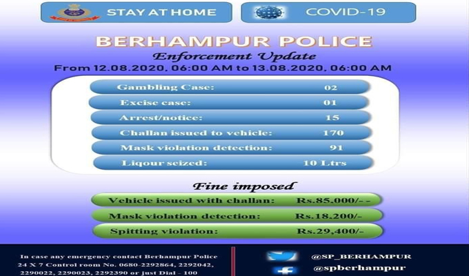 ବ୍ରହ୍ମପୁର ଅଫିସ,୧୩ା୮: ଗଞ୍ଜାମ ଜିଲାରେ କରୋନା ସଂକ୍ରମିତଙ୍କ ସଂଖ୍ୟା ବଢ଼ିବା ସହ ଦିନକୁ ଏହାର ସ୍ଥିତି ସଙ୍ଗୀନ ହେବାରେ ଲାଗିଛି। ଏହାର ମୁକାବିଲା ପାଇଁ ଲକ୍‌ଡାଉନ୍‌ କଟକଣା ଜାରି କରାଯାଇଛି। ଏପରିକି ଅପରାହ୍ନ ୪ ଟାଠାରୁ ତା’ପରଦିନ ସକାଳ ୬ ଟା ଯାଏ ରାତ୍ରିକାଳୀନ କର୍ଫ୍ୟୁ ମଧ୍ୟ ଘୋଷଣା କରାଯାଇଛି। ହେଲେ ଜାରି ହୋଇଥିବା ଏହି କଟକଣା ସମୟରେ ବ୍ରହ୍ମପୁର ପୋଲିସ ଜିଲାରେ ଅଯଥାରେ ଘୂରି ବୁଲୁଥିବା ଅମାନିଆଙ୍କୁ ପୋଲିସ ଅଟକାଇ ଯାଞ୍ଚ କରିବା ସହ ସେମାନଙ୍କଠାରୁ ଜରିମାନା ଆଦାୟ କରିବା ସହ ସେମାନଙ୍କ ବିରୋଧରେ ଇ-ଚାଲାଣ କରିଛି । ଏପରିକି ଜନସାଧାରଣଙ୍କୁ ମାସ୍କ ପିନ୍ଧିବାକୁ ନିର୍ଦେଶ ଦିଆଯିବା ସହ ଯାଞ୍ଚ ବ୍ୟବସ୍ଥାକୁ କଡ଼ାକଡ଼ି କରାଯାଇଛି। ଏଭଳି କଡ଼ା ନିର୍ଦ୍ଦେଶ ସତ୍ତ୍ୱେ ଲୋକମାନେ ନିୟମ ଉଲ୍ଲଂଘନ କରି ସହରରେ ଅଯଥାରେ ଘୂରି ବୁଲୁଛନ୍ତ। ଫଳରେ ପୋଲିସ ବାଧ୍ୟ ହୋଇ ସେମାନଙ୍କ ଠାରୁ ପ୍ରତିଦିନ ମୋଟା ଅଙ୍କର ଜରିମାନା ଆଦାୟ କରୁଛି। ଗତ ୧୨ ତାରିଖ ସକାଳ ୬ରୁ ୧୩ ତାରିଖ ସକାଳ ୬ଟା ସୁଦ୍ଧା ପୋଲିସ ପକ୍ଷରୁ ବିଭିନ୍ନ ଛକରେ ଚେକିଂ କରାଯାଇ ମାସ୍କ ପିନ୍ଧି ନ ଥିବା ୯୧ ଜଣଙ୍କ ଠାରୁ ୧୮ ହଜାର ୨୦୦ ଟଙ୍କା ଜରିମାନା ଆଦାୟ କରାଯାଇଛି ସେହିପରି ଟ୍ରାଫିକ ନିୟମ ଉଲ୍ଲଂଘନ କରିଥିବା ୧୭୦ ଜଣ ଅମାନିଆ ଗାଡ଼ି ଚାଳକଙ୍କୁ ୮୫ ହଜାର ଟଙ୍କା ଜରିମାନା ଧାର୍ଯ୍ୟ କରାଯାଇଛି। ସେହିପରି ଏହି ମହାମାରୀ ନିୟମ ଉଲ୍ଲଂଘନ କରି ବେଆଇନ ଭାବେ ମଦ ବିକ୍ରି କରୁଥିବା ବେଳେ ପୋଲିସ ଜଣଙ୍କୁ ଗିରଫ କରିବା ସହ ୧୦ ଲିଟର ମଦ ଜବତ କରିଛି । ଲକ୍‌ଡାଉନ୍‌ କଟକଣା ଉଲ୍ଲଂଘନ କରି ପୃଥକ ଭାବେ ଚାଲିଥିବା ଜୁଆଆଡ୍ଡାରେ ପୋଲିସ ଚଢ଼ାଉ କରି ଜୁଆଡ଼ିଙ୍କୁ ଗିରଫ କରିଛି। ୧୫ ଜଣଙ୍କୁ ଗିରଫ ନୋଟିସ ଦେଇଛି। ସେହିପରି ରାସ୍ତାରେ ଛେପ ପକାଇଥିବା ଅଭିଯୋଗରେ ପୋଲିସ ଅମାନିଆଙ୍କ ନିକଟରୁ ୨୯ ହଜାର ୪ ଶହ ଟଙ୍କା ଜରିମାନା ମଧ୍ୟ ଆଦାୟ କରିଛି। ଏନେଇ ବ୍ରହ୍ମପୁର ଏସ୍‌ପି ପିନାକ ମିଶ୍ର ଟୁଇଟ୍‌ ଜରିଆରେ ଗୁରୁବାର ସୂଚନା ଦେଇଛନ୍ତି।