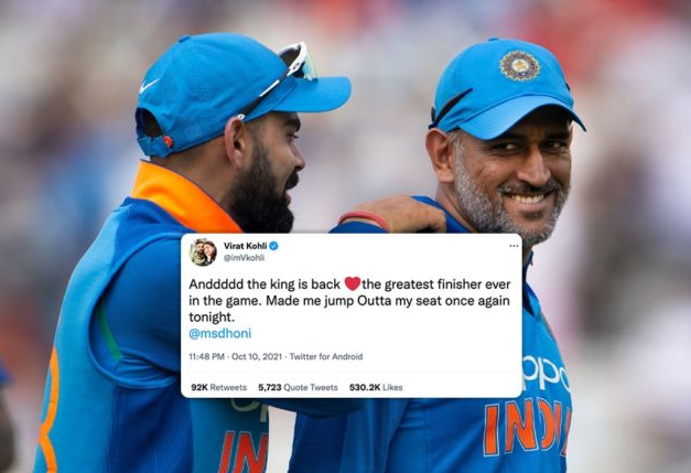 ଦିଲ୍ଲୀ କ୍ୟାପିଟାଲ୍ସ ବିପକ୍ଷ ଆଇପିଏଲ-୧୪ର ପ୍ରଥମ କ୍ୱାଲିଫାୟାରରେ ଅନ୍ତିମ ଓଭରରେ ରୋମାଞ୍ଚକ ଢ଼ଙ୍ଗରେ ଚେନ୍ନାଇ ସୁପର କିଙ୍ଗ୍ସ (ସିଏସ୍କେ)କୁ ଜିତାଇ ଫାଇନାଲରେ ପହଞ୍ଚାଇଥିଲେ ପୂର୍ବତନ ଭାରତୀୟ ଅଧିନାୟକ। ଏହା ଉପରେ କୋହଲି ଟୁଇଟ୍ କରି ଲେଖିଥିଲେ, ”କ୍ରିକେଟ ଇତିହାସର ଶ୍ରେଷ୍ଠ ଫିନିଶର ପୁଣି ଥରେ ଫେରିଛନ୍ତି। ଧୋନୀ ପୁଣି ଥରେ ମୋ ସିଟ୍ରୁ ମୋତେ ଡେଇଁବାକୁ ବାଧ୍ୟ କରିଛନ୍ତି।“ ୩୨ ବର୍ଷୀୟ କ୍ରିକେଟର ଅକ୍ଟୋବର ୧୦ ତାରିଖରେ ଏହି ଟୁଇଟ୍ କରିଥିଲେ। ଏହାକୁ ୫୩୦.୨ ହଜାର ଲାଇକ୍ ମିଳିଛି।