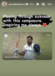 ଇନ୍ଷ୍ଟାଗ୍ରାମ ଷ୍ଟାଟସ୍ରେ କୋହଲିଙ୍କ ଭିଡିଓ ଶେୟାର କରି ଅନୁଷ୍କା କହିଛନ୍ତି, ବିରାଟ ଅସୁସ୍ଥ ଥିବା ସତ୍ତ୍ୱେ ଏତେ ବଡ଼ ଇନିଂସ ଖେଳିଥିଲେ। ତୁମେ ମୋତେ ସବୁବେଳେ ପ୍ରେରଣା ଦେଇଛ। କୋହଲି ୧୨୦୫ ଦିନ ପରେ ଟେଷ୍ଟ କ୍ରିକେଟରେ ଏକ ଶତକ ହାସଲ କରିଥିଲେ। ଏହା ହେଉଛି ତାଙ୍କର ୨୮ତମ ଟେଷ୍ଟ ଶତକ। ବିରାଟ ଶେଷ ଥର ପାଇଁ ୨୩ ନଭେମ୍ବର ୨୦୧୯ ରେ କୋଲକାତାରେ ବାଂଲାଦେଶ ବିପକ୍ଷରେ ଶତକ ହାସଲ କରିଥିଲେ।