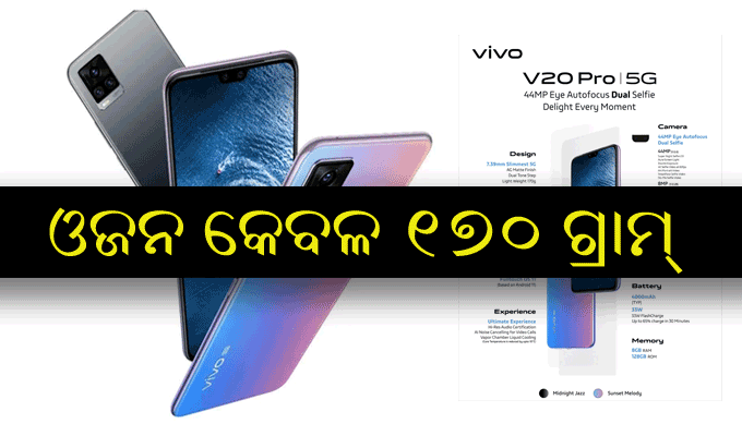 ନୂଆଦିଲ୍ଲୀ,୨।୧୨: ଗ୍ଲୋବାଲ ସ୍ମାର୍ଟଫୋନ କମ୍ପାନୀ ଭିଭୋ ପକ୍ଷରୁ ସବୁଠାରୁ ପତଳା ୫ଜି ଫୋନ୍ ଭି-୨୦ ପ୍ରୋ ଲଞ୍ଚ କରାଯାଇଛି। ଭାରତରେ ଏହାର ମୂଲ୍ୟ ୨୯,୯୯୦ ଟଙ୍କା ରଖାଯାଇଛି। ଭିଭୋର ବି-ସିରିଜର ଏହି ସ୍ମାର୍ଟଫୋନ୍ ଦୁଇଟି ରଙ୍ଗରେ ଉପଲବ୍ଧ ହେବ। ଏହା ୭.୩୯ ମିମି ଲମ୍ବ ଥିବା ବେଳେ ଓଜନ କେବଳ ୧୭୦ ଗ୍ରାମ୍ ରହିଛି।