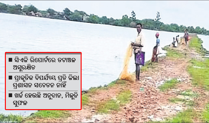 ସିଏଜି ରିପୋର୍ଟ ଅନୁଯାୟୀ, ତଟାଞ୍ଚଳରେ ଶିଳ୍ପାଞ୍ଚଳ ବିକଶିତ ହୋଇଛି। ସେହିପରି ଚିଙ୍ଗୁଡ଼ିଘେରି, ବହୁମାତ୍ରାରେ ବସବାସ ବଢ଼ିଛି। ଏଥିପାଇଁ ତଟବନ୍ଧ ଓ ପରିବେଶ ଅସୁରକ୍ଷିତ ହୋଇଛି। ପାରାଦୀପ ଓ ଧାମରା ମଧ୍ୟରେ ଥିବା ଉପକୂଳ ଅଞ୍ଚଳର ପରିବେଶ ନିରୀକ୍ଷଣ ପାଇଁ ୨୦୧୩ରୁ ୨୦୧୫ ମଧ୍ୟରେ ୨ କୋଟି ୧୭ ଲକ୍ଷ ଟଙ୍କା ବ୍ୟୟରେ ୧୯ଟି ପରୀକ୍ଷାଗାର ପାଇଁ ଓଡ଼ିଶା ରାଜ୍ୟ ପ୍ରଦୂଷଣ ନିୟନ୍ତ୍ରଣ ବୋର୍ଡକୁ ହସ୍ତାନ୍ତର କରାଯାଇଥିଲା। ଏହି ପରୀକ୍ଷାଗାର ମାଧ୍ୟମରେ ପରିବେଶ ସମ୍ବନ୍ଧୀୟ ତଥ୍ୟ ହାସଲ କରାଯିବା କଥା। ମାତ୍ର ଏହି ବୋର୍ଡ ୩୩ରୁ ୫୯ ପ୍ରତିଶତ କାର୍ଯ୍ୟକାରୀ ହୋଇଛି। ଜଳ ଓ ବାୟୁର ମାନ ନିର୍ଦ୍ଧାରଣ କରିବା କ୍ଷେତ୍ରରେ ବହୁ ପଛୁଆ ଅଛି। ୨୦୧୬ରୁ ୨୦୧୮ ମଧ୍ୟରେ ରାଜନଗର ମ୍ୟାନ୍ଗ୍ରୋଭ ଫରେଷ୍ଟ ଡିଭିଜନ ଓ ପୁରୀ ବନ୍ୟପ୍ରାଣୀ ଡିଭିଜନ ଅଧୀନରେ ୨୨୮ ହେକ୍ଟର ଜମିରେ ହେନ୍ତାଳବଣ ସୃଷ୍ଟି ହୋଇଥିବା ଦର୍ଶାଯାଇଥିଲେ ମଧ୍ୟ ତଦନ୍ତ ସମୟରେ ଶୂନ୍ରୁ ୩୫ ପ୍ରତିଶତ ଗଛ ଦେଖିବାକୁ ମିଳିଛି। ସେହିପରି କେନ୍ଦ୍ରାପଡ଼ା ଜିଲା ପେଣ୍ଠଠାରେ ପ୍ରାୟ ୩୩ କୋଟି ଟଙ୍କା ଖର୍ଚ୍ଚ ହୋଇ ଜିଓ ସିନ୍ଥେଟିକ୍ ବନ୍ଧ ନିର୍ମାଣ ହୋଇଥିଲା। ମାତ୍ର ଏହି ୱାଲ୍ର ଗାବିୟନ ବକ୍ସରୁ ପଥର ବାହାରି ସମୁଦ୍ର ମଧ୍ୟକୁ ଚାଲି ଯାଉଛି। ୨୦୧୮ରେ ଏହି ଟ୍ୟୁବ୍ୱାଲର ସୁରକ୍ଷା ପାଇଁ ରାଜ୍ୟ ପାଣ୍ଠିରୁ ୪ କୋଟି ୬୫ ଲକ୍ଷ ଟଙ୍କା ଖର୍ଚ୍ଚ ହୋଇଥିଲେ ମଧ୍ୟ ଏହାର ତଦନ୍ତ ସମୟରେ ପେଣ୍ଠ ତଟାଞ୍ଚଳର ସୁରକ୍ଷା ନେଇ ପ୍ରଶ୍ନ ଉଠିଛି। ଏଥିସହ ୨୦୧୯ ଅଗଷ୍ଟରେ ଟ୍ୟୁବ୍ୱାଲରେ ନିଅଁା ଲାଗିଥିବାରୁ ଅଧିକ ୩ କୋଟି ୨୮ ଲକ୍ଷ ଟଙ୍କା ଖର୍ଚ୍ଚ ହୋଇଛି। ଏହା ବ୍ୟତୀତ ତଟବନ୍ଧ ସୁରକ୍ଷାକୁ ନେଇ ସିଏଜି ରିପୋର୍ଟ ବହୁ ପ୍ରଶ୍ନ ଉଠାଯାଇଥିଲା। ସୂଚନାଯୋଗ୍ୟ, କେନ୍ଦ୍ରାପଡ଼ା ଜିଲାରେ ମୋଟ ୭୪୪.୩୭ କିମିର ଲୁଣା ତଟବନ୍ଧ ଅଛି। ଏହି ବନ୍ଧ ଅସୁରକ୍ଷିତ ଥିବାରୁ ବନ୍ୟା ବାତ୍ୟା ପରି ପ୍ରାକୃତିକ ବିପର୍ଯ୍ୟୟ ସମୟରେ ଜିଲାର ୪୫୫ ଗ୍ରାମାଞ୍ଚଳରେ ସମୁଦ୍ର ଓ ନଦୀ ଜଳ ପଶିଆସୁଛି। ଏଥିସହ ଜିଲାରେ ମୋଟ ୬୪ଟି ଗ୍ରାମକୁ ସୁନାମିପ୍ରବଣ ବୋଲି ଚିହ୍ନଟ କରାଯାଇଛି।