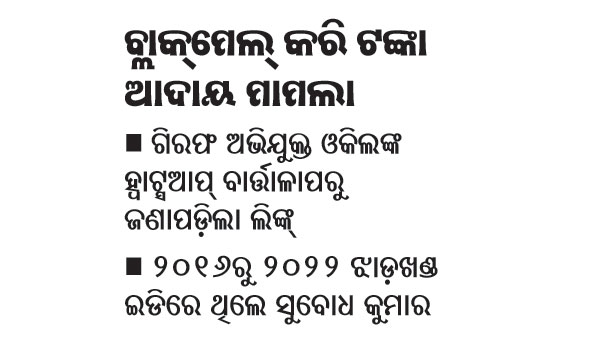ସୂଚନା ଅନୁଯାୟୀ, ପଶ୍ଚିମବଙ୍ଗର ସେଣ୍ଟ୍ରାଲ କୋଲ୍କାତାରେ ଥିବା ଏକ ଶପିଂ ମଲ୍ର ମାଲିକ ଅମିତ ଅଗ୍ରୱାଲଙ୍କ ବିରୋଧରେ ଓକିଲ ରାଜୀବ କୁମାର ରାଞ୍ଚି ହାଇକୋର୍ଟରେ ଜନସ୍ବାର୍ଥ ମାମଲା(ପିଆଇଏଲ୍) ରୁଜୁ କରିଥିଲେ। ଉକ୍ତ ପିଆଇଏଲ୍ରୁ ଅମିତଙ୍କ ନାମ ହଟାଇବାକୁ ରାଜୀବ ତାଙ୍କୁ ବ୍ଲାକ୍ମେଲ କରି ୧୦ କୋଟି ଟଙ୍କା ଦାବି କରିଥିଲେ। ପରେ ଏହି ଡିଲ୍ ୧କୋଟିରେ ଛିଡ଼ିଥିଲା। ତେବେ ଅଗଷ୍ଟ ୧ରେ ରାଜୀବ ଉକ୍ତ ଶପିଂ ମଲ୍ର ମାଲିକ ଅମିତଙ୍କଠାରୁ ଅଗ୍ରୀମ ୬୦ଲକ୍ଷରୁ ଊର୍ଦ୍ଧ୍ୱ ଟଙ୍କା ନେଉଥିବାବେଳେ କୋଲ୍କାତା ପୋଲିସ ଡିଟେକ୍ଟିଭ୍ ଡିପାର୍ଟମେଣ୍ଟ୍ର ଏକ ଟିମ୍ ତାଙ୍କୁ ଗିରଫ କରିଥିଲା। ଏହାପରେ ଅଭିଯୁକ୍ତ ରାଜୀବଙ୍କ ରାଞ୍ଚତ୍ସ୍ଥିତ ବାସଭବନରେ ପୋଲିସ ଟିମ୍ ଚଢ଼ାଉ କରି ବିଭିନ୍ନ ଦସ୍ତାବିଜ୍ ଜବତ କରିଥିଲା। ରାଜୀବ ଏକାଧିକ ବ୍ୟକ୍ତିଙ୍କ ବିରୋଧରେ କୋର୍ଟରେ ପିଆଇଏଲ୍ ରୁଜୁ କରିବା ପରେ ବ୍ଲାକମେଲ୍ କରି ଟଙ୍କା ଆଦାୟ କରିଥିବା ଉକ୍ତ ଦସ୍ତାବିଜ୍ରୁ ଜଣାପଡ଼ିଥିଲା। ସେହିପରି ରାଜୀବଙ୍କ ହ୍ବାଟ୍ସଆପ୍ ଯାଞ୍ଚ ସମୟରେ ସେ ଅନେକ ଥର ଇଡି ଅଧିକାରୀ ସୁବୋଧଙ୍କ ସହ କଥା ହୋଇଥିବା ପୋଲିସ ଜାଣିବାକୁ ପାଇଥିଲା। ଏହାପରେ ଉକ୍ତ ମାମଲାରେ ସୁବୋଧଙ୍କ ସମ୍ପୃକ୍ତି ଥିବା ପୋଲିସ ସନ୍ଦେହ କରି ତାଙ୍କୁ ପଚରାଉଚରା ପାଇଁ ପଶ୍ଚିମବଙ୍ଗ ପୋଲିସ ନୋଟିସ୍ ଜାରି କରିଥିଲା।