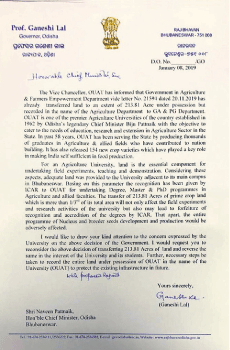 ଏହି ଜମିକୁ ଫେରାଇ ଦେବା ଲାଗି ୨୦୧୯ ଡିସେମ୍ବରରେ ଓୟୁଏଟି କୁଳପତି ପଓ୍ବନ କୁମାର ଅଗ୍ରୱାଲ କୁଳାଧିପତି ତଥା ରାଜ୍ୟପାଳ ଗଣେଶୀ ଲାଲଙ୍କୁ ଚିଠି ଲେଖି ଅବଗତ କରାଇଥିଲେ। କୃଷି ଓ କୃଷକ ସଶକ୍ତୀକରଣ ବିଭାଗ ତା’ର ଚିଠି ନଂ.୨୧୫୯୪ ତାରିଖ ୨୦.୧୧.୨୦୧୯ରେ ଜମି ହସ୍ତାନ୍ତର ନେଇ ଓୟୁଏଟିକୁ ସୂଚନା ଦେଇଥିବା କୁଳପତି ଅଗ୍ରଓ୍ବାଲ କୁଳାଧିପତିଙ୍କୁ ଜଣାଇଥିଲେ। କୁଳାଧିପତି ମଧ୍ୟ ଏହାକୁ ଅତି ଗୁରୁତ୍ୱର ସହ ନେଇ ୨୦୨୦ ଜାନୁୟାରୀ ୮(ଚିଠିରେ ୨୦୨୦ ପରିବର୍ତ୍ତେ ୨୦୧୯ ଉଲ୍ଲେଖ ରହିଛି)ରେ ଓୟୁଏଟିକୁ ଉକ୍ତ ଜମି ଫେରାଇ ଦେବାକୁ ମୁଖ୍ୟମନ୍ତ୍ରୀଙ୍କୁ ଚିଠି ଲେଖିଥିଲେ। ଚିଠିରେ ଉଲ୍ଲେଖ ତାରିଖ ଦ୍ୱନ୍ଦ୍ୱ ସୃଷ୍ଟି କରିଥିଲେ ମଧ୍ୟ ପ୍ରସଙ୍ଗ ଅତ୍ୟନ୍ତ ଗମ୍ଭୀର ରହିଛି। ବିଶ୍ୱବିଦ୍ୟାଳୟ ଏବଂ ଛାତ୍ରୀଛାତ୍ରମାନଙ୍କର ହିତ ଦୃଷ୍ଟିରୁ ୨୧୩.୮୧ ଏକର ଜମିର ମାଲିକାନା ସ୍ବତ୍ୱ ଓୟୁଏଟିକୁ ଫେରାଇ ଦେବାକୁ କୁଳାଧିପତି ଚିଠିରେ ଉଲ୍ଲେଖ କରିଛନ୍ତି। ହେଲେ ପ୍ରାୟ ୮ ମାସ ହେବ କୁଳାଧିପତି ଜମି ଫେରାଇ ଦେବାକୁ ଚିଠି ଲେଖିଲେ ମଧ୍ୟ ଏ ନେଇ କୌଣସି ପଦକ୍ଷେପ ନିଆଯାଇ ନ ଥିବା ଜଣାପଡ଼ିଛି। ଉକ୍ତ ଜମିକୁ ଫେରାଇ ନ ଦେଲେ ବିଶ୍ୱବିଦ୍ୟାଳୟ କେବଳ ନାମକୁ ମାତ୍ର ହୋଇ ରହିଯିବ ବୋଲି ଶିକ୍ଷାବିତ୍ମାନେ ଆଶଙ୍କା କରିଛନ୍ତି।