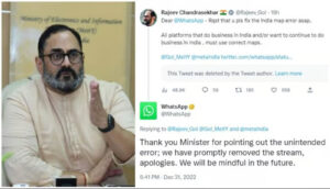ରାଜୀବ ଚନ୍ଦ୍ରଶେଖର ହ୍ବାଟ୍ସଆପ୍ ଆପ୍ ଭିଡିଓକୁ ଜବାବ ଦେଇ କହିଛନ୍ତି,ପ୍ରିୟ ହ୍ବାଟ୍ସଆପ୍ ଆପ, ଆପଣଙ୍କୁ ଯଥାଶୀଘ୍ର ଭାରତର ମାନଚିତ୍ରର ଭୁଲ ସଂଶୋଧନ କରିବାକୁ ଅନୁରୋଧ କରାଯାଉଛି। ଭାରତରେ ବ୍ୟବସାୟ କରୁଥିବା କିମ୍ବା ଭାରତରେ ବ୍ୟବସାୟ ଜାରି ରଖିବାକୁ ଚାହୁଁଥିବା ସମସ୍ତ ପ୍ଲାଟଫର୍ମ ମାନଚିତ୍ରକୁ ସଠିକ ବ୍ୟବହାର କରାଯିବା ଉଚିତ୍।