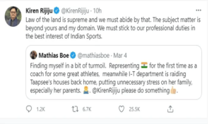ମାଥିୟସ୍ ଟୁଇଟ୍ କରି ମନ୍ତ୍ରୀଙ୍କୁ କହିଥିଲେ, ଭାରତରେ ପ୍ରଥମ ଥର କୋଚ୍ ଭାବେ ପ୍ରତିନିଧିତ୍ୱ କରୁଛି। ହେଲେ ତାପସୀଙ୍କ ମା’ବାପା ଅସୁବିଧାରେ ଅଛନ୍ତି। ଏହା ମୋତେ ଚକିତ କରିଛି। ଆପଣ କିଛି କରନ୍ତୁ ବୋଲି ସେ କହିଥିଲେ। ଏହାର ଜବାବରେ ମନ୍ତ୍ରୀ କହିଛନ୍ତି, ଭାରତରେ ସର୍ବୋଚ୍ଚ ସ୍ଥାନରେ ଆଇନ୍ ରହିଛି। ଆମକୁ ଏହାକୁ ପାଳନ କରିବାକୁ ହେବ। ଏହା ଆପଣ-ମୋର ମାମଲାଠାରୁ ବହୁତ ଆଗରେ। ଆମକୁ ଆମର କର୍ତ୍ତବ୍ୟ କରିବାକୁ ହେବ। ଭାରତୀୟ ଖେଳଜଗତ ପାଇଁ ଏହା ସବୁଠାରୁ ଠିକ୍ ହେବ ବୋଲି କହିଛନ୍ତି।