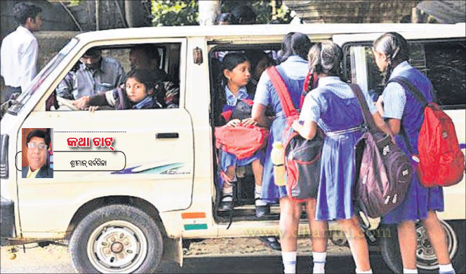 ସ୍କୁଲଗାଡ଼ି ଆସିଗଲା l ଗାଡ଼ି କହିଲେ ଗାଁ ଗହଳିର ଟ୍ରଲିରିକ୍ସl ଗୋଟେ l ତା’ ପଟାଉପର ଚାରିକଡେ ଟିଣ ତାରଜାଲି କଭର କରାଯାଇଛି l ପଛପଟରେ ଗେଟ l ତା ଭିତରେ ଛୁଆ ବସିବାକୁ ଚାଖଣ୍ଡେ ଚଉଡା ପାଞ୍ଚଫୁଟିଆ ପଟା ଦୁଇପଟେ ବେଞ୍ଚପରି ବାଡ଼ିଆ ହୋଇଛି l ଦଶଟା ଛୁଆଙ୍କୁ ଖୁନ୍ଦିଖାନ୍ଦି ତା’ ଭିତରେ ପୂରେଇ ପଛଗେଟରେ ବାହାରୁ କିଳିଣିଦେଇ ଟ୍ରଲିଭାଇ ଚଳେଇବା ଆରମ୍ଭ କଲେ l ଟ୍ରଲିବାଲାକୁ ପିଲାଏ ଅଙ୍କଲ ଡାକନ୍ତି l