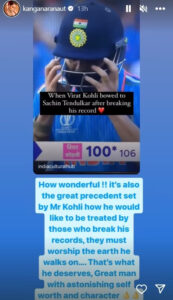 ଏହି ଭିଡିଓ ଶେୟାର କରି କଙ୍ଗନା ଲେଖିଛନ୍ତି, କେତେ ଆଶ୍ଚର୍ଯ୍ୟଜନକ !! ଏହା ମିଷ୍ଟର କୋହଲିଙ୍କ ଦ୍ୱାରା ସ୍ଥାପିତ ହୋଇଥିବା ଏକ ଭଲ ଉଦାହରଣ। ଯେଉଁମାନଙ୍କ ରେକର୍ଡ ଭଙ୍ଗାଯାଏ ସେମାନଙ୍କ ପ୍ରତି କିପରି ବ୍ୟବହାର କରାଯିବ ତାହା ସେ ଜଣାଇଲେ। ଯେଉଁ ଧରିତ୍ରୀ ଉପରେ ସେ ଚାଲୁଛନ୍ତି ତାକୁ ପୂଜା କରିବା ଉଚିତ୍‌। ଚମତ୍କାର ଏବଂ ଉତ୍ତମ ଚରିତ୍ର ବିଶିଷ୍ଟ ଜଣେ ମହାନ ବ୍ୟକ୍ତି, ସେ ଏହା ପାଇବାକୁ ଯୋଗ୍ୟ।