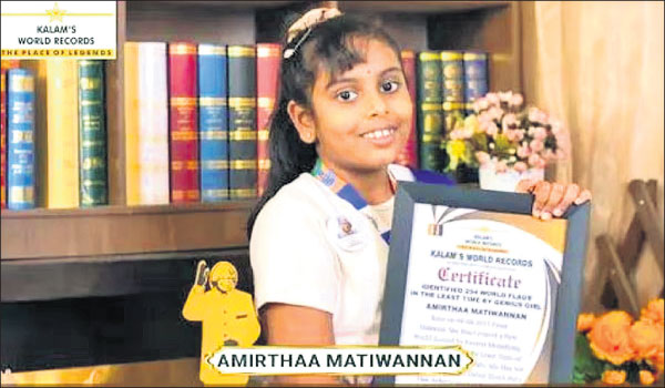 କୁଆଲାଲମ୍ପୁର: କୌଣସି ଦେଶ ପାଇଁ ତା’ ରାଷ୍ଟ୍ରୀୟ ପତାକା ସବୁଠୁ ମୂଲ୍ୟବାନ ହୋଇଥାଏ, ଯାହା ଦ୍ୱାରା ସେ ପୂରା ବିଶ୍ୱରେ ପରିଚିତ ହୋଇଥାଏ। ଲୋକେ ସବୁ ସ୍ଥାନରେ ନିଜ ଦେଶର ପତାକାକୁ ଆଗରେ ଦେଖିବାକୁ ପସନ୍ଦ କରିବା ସହ ତାକୁ ସହଜରେ ଚିହ୍ନି ଦିଅନ୍ତି। ଏହାଛଡ଼ା କିଛି ଦେଶ ରହିଛି, ଯାହାର ପତାକା ଲୋକଙ୍କୁ ଜଣାଥିବ। ହେଲେ ମାଲେସିଆର ପେନାଙ୍ଗର ଜଣେ ୮ ବର୍ଷର ଝିଅ, ଯିଏକି ନିଜ ମୁଖରେ ପୂରା ବିଶ୍ୱରେ ଥିବା ସମସ୍ତ ଦେଶର ପତାକା ବାବଦରେ ସବିଶେଷ ଜ୍ଞାନ ରହିଛି। ସେ ନିକଟରେ ୨୫୦ରୁ ଅଧିକ ଦେଶର ପତାକାକୁ ଚିହ୍ନି ୱାଲର୍‌ଡ ରେକର୍ଡ କରିଛନ୍ତି। ତାହା ପୁଣି ବହୁତ କମ୍‌ ସମୟରେ। ଅମ୍ରିଥା ମତିୱାନାନ୍‌ ୨୫୪ ଦେଶର ପତାକାକୁ ୪ ମିନିଟ୍‌ ୨୧ ସେକେଣ୍ଟରେ ଚିହ୍ନଟ କରି ୱାଲର୍‌ଡ ରେକର୍ଡ କରିଛନ୍ତି। ଏହି ରେକର୍ଡକୁ କଲାମ ୱାଲର୍‌ଡ ରେକର୍ଡରେ ସାମିଲ କରାଯାଇଛି। ଏହାଛଡ଼ା କାନାଡାର କିଡ୍‌ସ ୱାଲର୍‌ଡ ରେକଡର୍‌ସ, ଇଣ୍ଟରନ୍ୟାଶନାଲ ବୁକ୍‌ସ ଅଫ୍‌ ରେକଡର୍‌ସ, ଜ୍ୟାକି ବୁକ୍‌ ଅଫ୍‌ ୱାଲର୍‌ଡ ରେକଡର୍‌ସ ଆଦି ୩ ଅର୍ଗାନାଇଜେଶନରୁ ମଧ୍ୟ ତାଙ୍କୁ ସାର୍ଟିଫିକେଟ୍‌ ମିଳିଛି। ତାଙ୍କ ମା’ କହିଛନ୍ତି, ଅମ୍ରିଥାଙ୍କୁ ଆଗରୁ ପତାକା ବିଷୟରେ ସେପରି କିଛି ଆଗ୍ରହ ନ ଥିଲା। ମାର୍ଚ୍ଚ ମାସରେ ସ୍କୁଲ ଛୁଟି ସମୟରେ ତାଙ୍କର ପତାକା ପ୍ରତି ଆଗ୍ରହ ବଢିଥିଲା। ସେ ସମସ୍ତ ଦେଶର ପତାକା ବିଷୟରେ ଜାଣିବାକୁ ଆରମ୍ଭ କଲେ ଏବଂ ଏପ୍ରିଲ ଶେଷ ଆଡ଼କୁ ୱାଲର୍‌ଡ ରେକର୍ଡ କଲେ। ଏବେ ଅମ୍ରିଥାଙ୍କୁ ଆହୁରି ଅନେକ ରେକର୍ଡ କରିବାକୁ ବାକି ଅଛି ବୋଲି ତାଙ୍କ ମା’ କହିଛନ୍ତି।