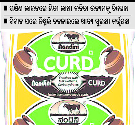 ନନ୍ଦିନୀ ନାମରେ ପରିଚିତ କର୍ନାଟକ ମିଲ୍କ ଫେଡେରେଶନ୍ (କେଏମ୍ଏଫ୍)ର ବୋର୍ଡ ଅଫ୍ ଡାଇରେକ୍ଟର୍ସ ଏଫ୍ଏସ୍ଏସ୍ଏଆଇ ଅର୍ଡର ବଳରେ ହିନ୍ଦୀ ଲଦିଦିଆଯାଇଥିବା ଅଭିଯୋଗ ଆଣି ଏହାକୁ ବିରୋଧ କରିବା ପରେ ବିବାଦ ସୃଷ୍ଟି ହୋଇଥିଲା। ସେହିପରି ତାମିଲନାଡୁ ମୁଖ୍ୟମନ୍ତ୍ରୀ ଏମ୍.କେ. ଷ୍ଟାଲିନ୍ ମଧ୍ୟ ଦକ୍ଷିଣ ଭାରତୀୟଙ୍କ ଉପରେ କେନ୍ଦ୍ର ସରକାର ହିନ୍ଦୀ ଭାଷାକୁ ଲଦିଦେଉଛନ୍ତି ବୋଲି ବୁଧବାର ଅଭିଯୋଗ ଆଣିଥିଲେ। ଏଥିସହ ଜାତୀୟ ଖାଦ୍ୟ ସୁରକ୍ଷା କର୍ତ୍ତୃପକ୍ଷଙ୍କୁ ସେ ଟାର୍ଗେଟ କରିଥିଲେ। ଏଭଳି ଉଦ୍ୟମ କରୁଥିବା ଲୋକଙ୍କୁ ଦକ୍ଷିଣ ଭାରତୀୟ ରାଜ୍ୟଗୁଡ଼ିକରୁ ବହିଷ୍କାର କରାଯିବ ବୋଲି ଷ୍ଟାଲିନ୍ ଟୁଇଟରରେ ଚେତାବନୀ ଦେଇଥିଲେ। କର୍ନାଟକର ପୂର୍ବତନ ମୁଖ୍ୟମନ୍ତ୍ରୀ ଏଚ୍.ଡି. କୁମାରସ୍ବାମୀ ମଧ୍ୟ ଏହାକୁ ବିରୋଧ କରିଥିଲେ। ନନ୍ଦିନୀ ପ୍ରଡକ୍ଟଗୁଡ଼ିକୁ ଏଫ୍ଏସ୍ଏସ୍ଏଆଇ ହାଇଜ୍ୟାକ୍ କରିନେବା ଦୁର୍ଭାଗ୍ୟଜନକ ବୋଲି ସେ ସମାଲୋଚନା କରିଥିଲେ। କେନ୍ଦ୍ରର ଶାସକ ଭାଜପା କେଏମ୍ଏଫ୍କୁ ଅମୂଲ ସହ ମିଶ୍ରଣ ପାଇଁ ଉଦ୍ୟମ କରୁଥିବା ଅଭିଯୋଗ ଆସିଥିବାବେଳେ ଏହି ବିବାଦ ଘନେଇଥିଲା। କେବଳ ବିରୋଧୀ ନୁହନ୍ତି, ଭାଜପା ନେତାମାନେ ମଧ୍ୟ ଏଫ୍ଏସ୍ଏସ୍ଏଆଇର ନିଷ୍ପତ୍ତିକୁ ବିରୋଧ କରିଥିଲେ। ତାମିଲନାଡୁ ଭାଜପା ସଭାପତି ଏହି ନିର୍ଦ୍ଦେଶନାମାକୁ ପ୍ରତ୍ୟାହାର ଦାବି କରିଥିଲେ। ବିବାଦ ପରେ ଗୁରୁବାର ଏଫ୍ଏସ୍ଏସ୍ଏଆଇ କହିଛି, ଫୁଡ୍ ବିଜ୍ନେସ୍ ଅପରେଟର୍ସ (ଏଫ୍ବିଓ)ମାନେ ପ୍ୟାକେଟ୍ରେ ‘କର୍ଡ’ ଲେଖିପାରିବେ। ସେମାନେ ବନ୍ଧନୀରେ ସମାର୍ଥବୋଧକ ଶବ୍ଦ ‘ଦହି’, ‘ଥୟିର’ କିମ୍ବା ‘ମୋସାରୁ’ ଲେଖିବେ। ଇତିମଧ୍ୟରେ ଟୁଇଟରରେ ଦହି ବିରୋଧୀ ଅଭିଯାନ ‘ନେହିଁ ଟୁ ଦହି’ ବା ‘ଦହିକୁ ନା କୁହନ୍ତୁ’ ଟ୍ରେଣ୍ଡ୍ କରିଛି।