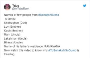 ସବୁଠାରୁ ଗୁରୁତ୍ୱପୂର୍ଣ୍ଣ କଥା ହେଲା, ତାଙ୍କ ଘରର ନାମ ରାମାୟଣ ହୋଇଥିବା ବେଳେ ପରିବାରରେ ରାମାୟଣର ସମସ୍ତ ଚରିତ୍ରଙ୍କର ନାମ ରହିଛି। ଆଉ ତାଙ୍କୁ ହିଁ ରାମାୟଣ ସମ୍ପର୍କିତ ପ୍ରଶ୍ନର ଉତ୍ତର ଜଣା ନ ଥିବ ଏକଥା ଜାଣିବା ପରେ ଆଶ୍ଚର୍ଯ୍ୟ ହୋଇଥିଲେ ଅମିତାଭ। ଆଜ୍ଞା ହଁ,ରୁମାଦେବୀଙ୍କୁ ଏହାର ଉତ୍ତର ଜଣା ନ ଥିବା ବେଳେ ସୋନକ୍ଷୀ ପ୍ରଥମେ ସୀତା ଓ ପରେ ରାମ କହିଥିଲେ। ତେବେ ନିଜ ଉତ୍ତରରେ ସନୁଷ୍ଟ ନ ଥିବାରୁ ସେ ଲାଇଫ ଲାଇନର ସାହାଯ୍ୟ ନେଇଥିଲେ। ଆଉ ଏକ୍ସପର୍ଟ ଏହାର ଉତ୍ତର ଲକ୍ଷ୍ମଣ ଦେଇଥିଲେ। ଏହାପରେ ସୋନାକ୍ଷୀ ରାମାୟଣ ବିଷୟବସ୍ତୁଠାରୁ ଯେ ବହୁ ଦୂରରେ ଏହା ସ୍ପଷ୍ଟ ହେବା ସହ ଏହାକୁ ନେଇ ତାଙ୍କ ପ୍ରଶଂସକ ତାଙ୍କୁ ବଲିଉଡ୍ ଅଭିନେତ୍ରୀ ଆଲିଆ ଭଟ୍ଟ ଓ ଅନନ୍ୟା ପାଣ୍ଡେଙ୍କ ସହ ତୁଳନା କରିଛନ୍ତି। ଏଥିସହ ଏହାକୁ ନେଇ ଶନିବାର ସୋସିଆଲ ମିଡିଆରେ#YoSonakshiSoDumb ନମ୍ବର ଓ୍ବାନ ଟ୍ରେଣ୍ଡ ହୋଇଯାଇଥିବା ଦେଖିବାକୁ ମିଳିଛି।
